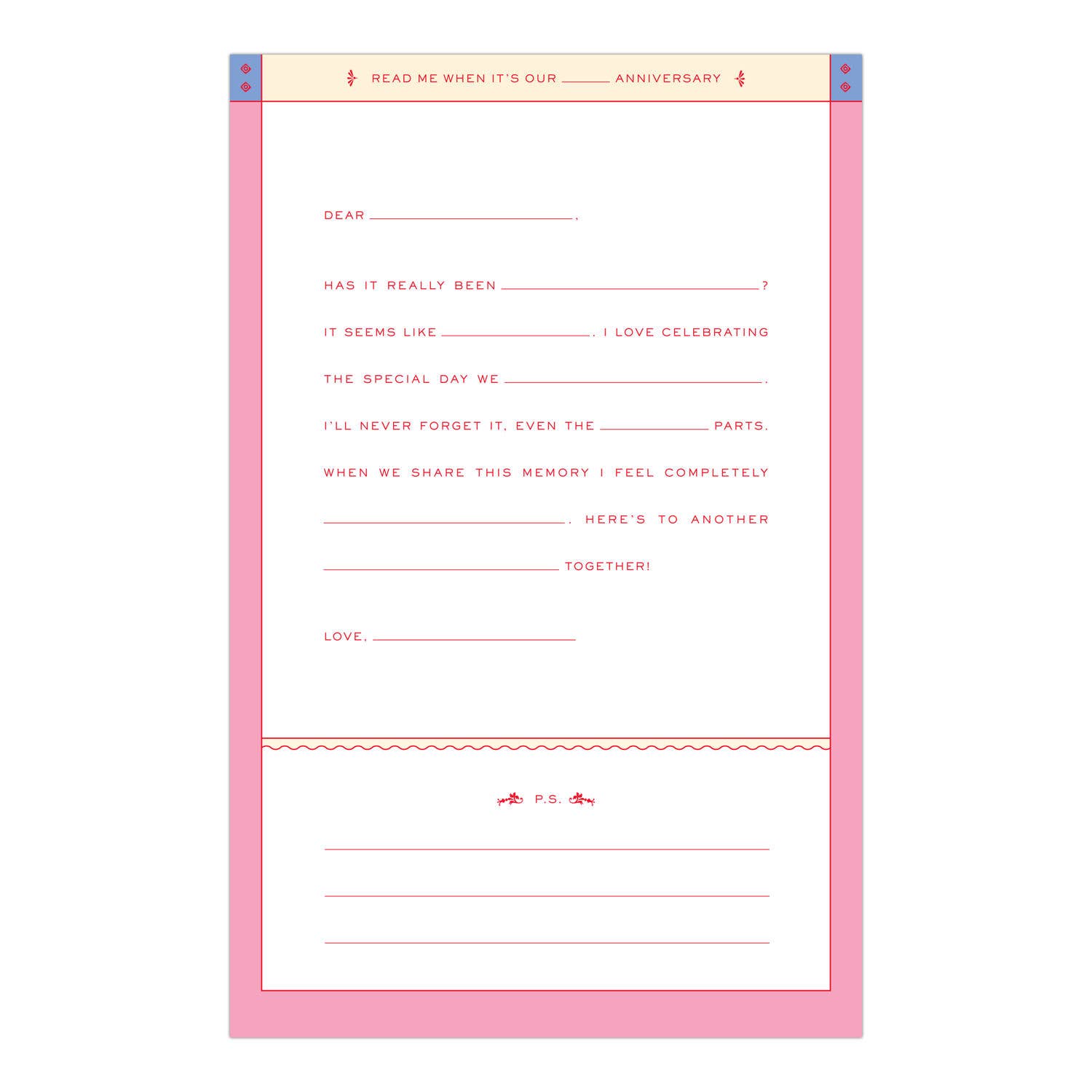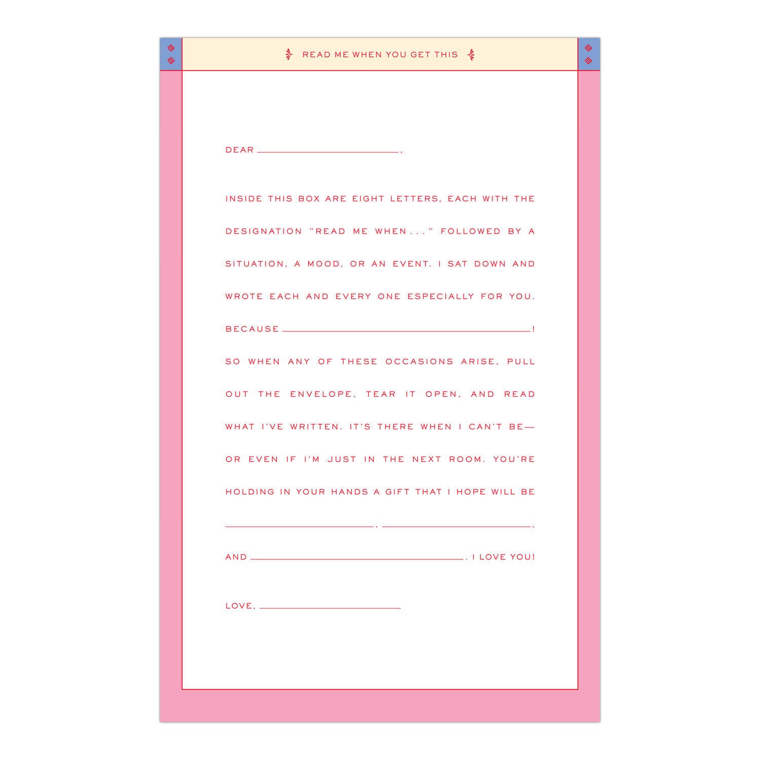 Create a treasure trove of letters for your main squeeze. Simply fill in the blanks on eight situation-specific missives, seal them in their corresponding envelopes, and present the whole package in its keepsake box. The letters can then be opened at just the right moment in the future to provide your personal thoughts and encouragement. Fill in the Love to create sweet love letters for him or her! Includes scenarios like "Read me when you've had a bad day" and "Read me when you're tempted to flirt" 7.25 x 4 inches; 9 cards and envelopes