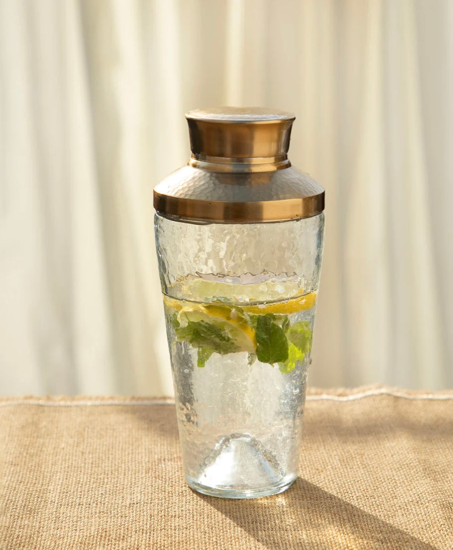 Elevate your bar with this cocktail shaker. Each one is handcrafted, made from partially recycled glass giving it a slight green hue.