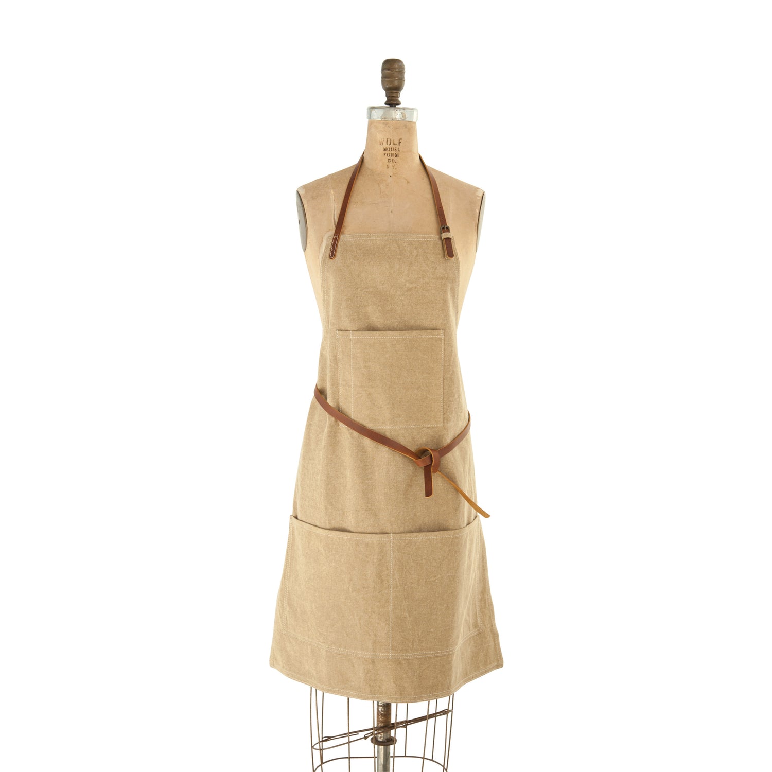 Thick natural canvas accented with leather ties is a gorgeous and unique apron to wear hosting a dinner party or baking day.