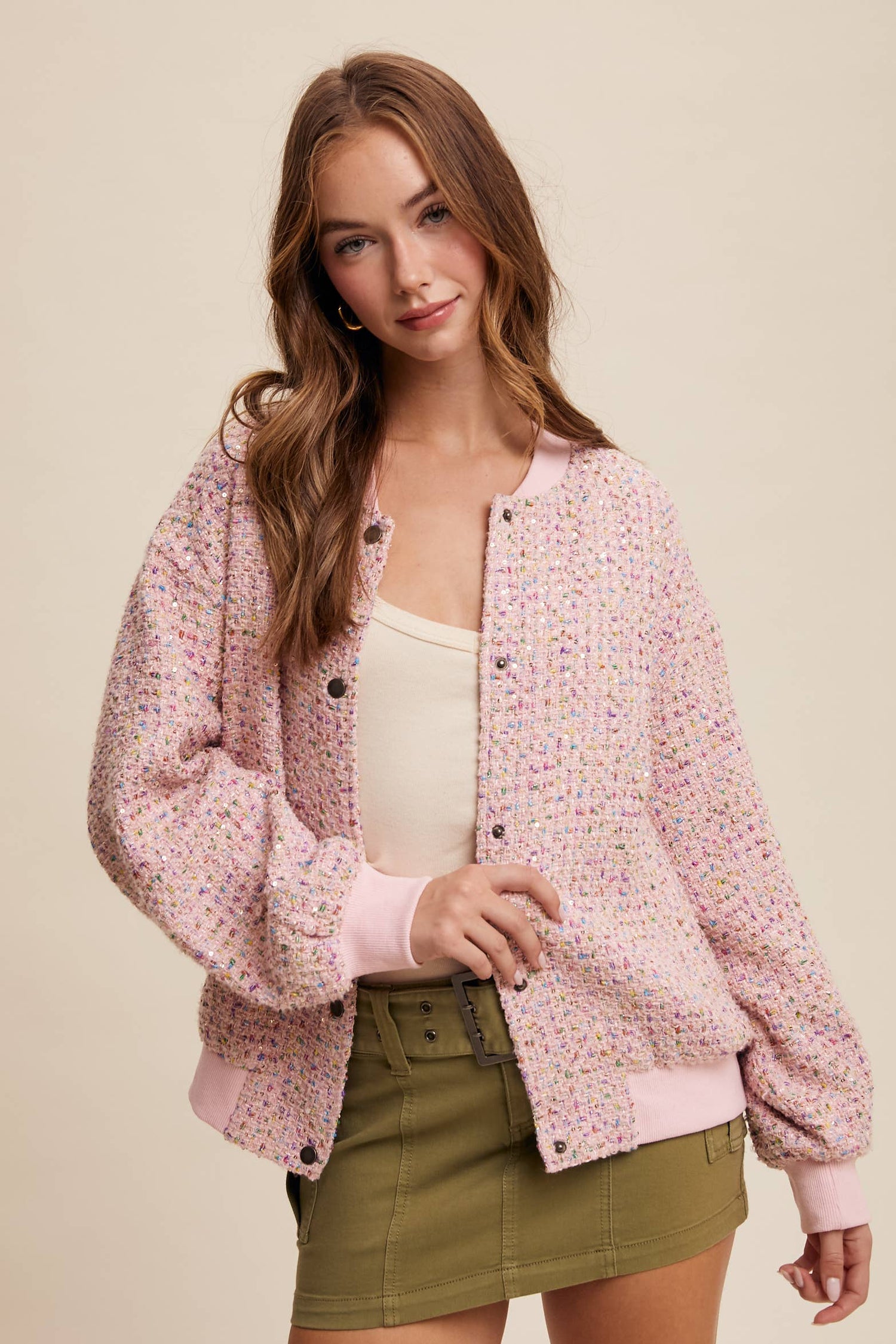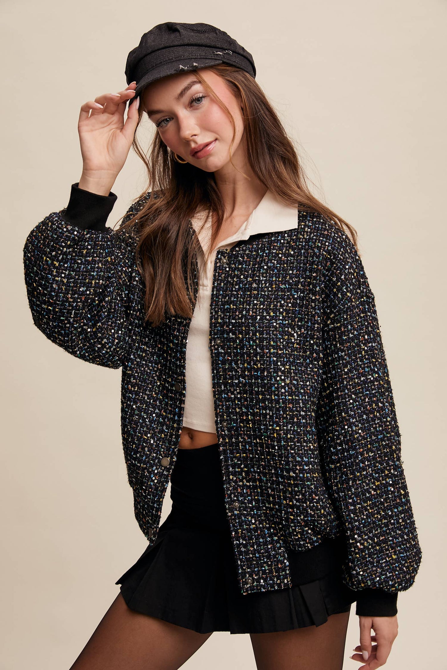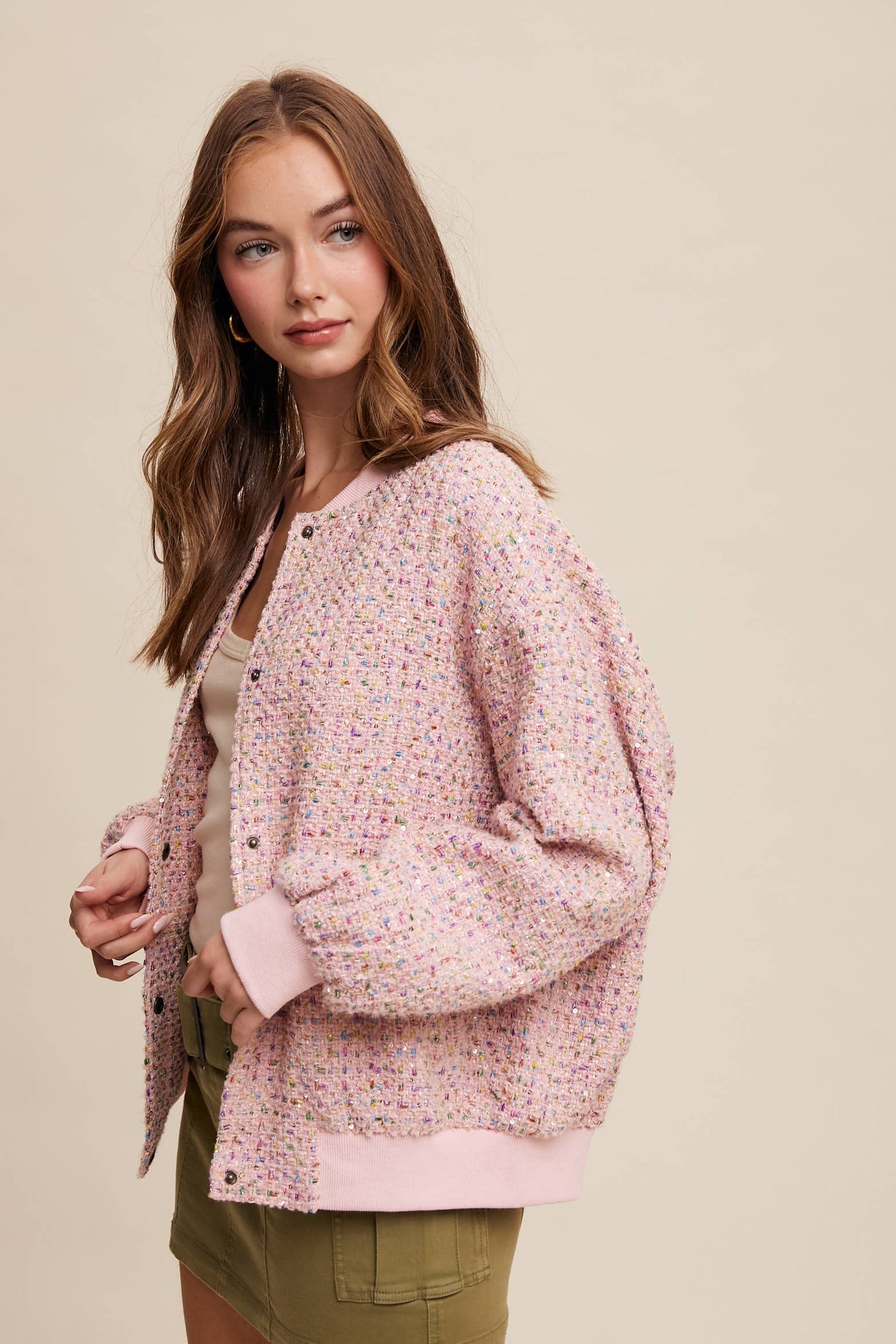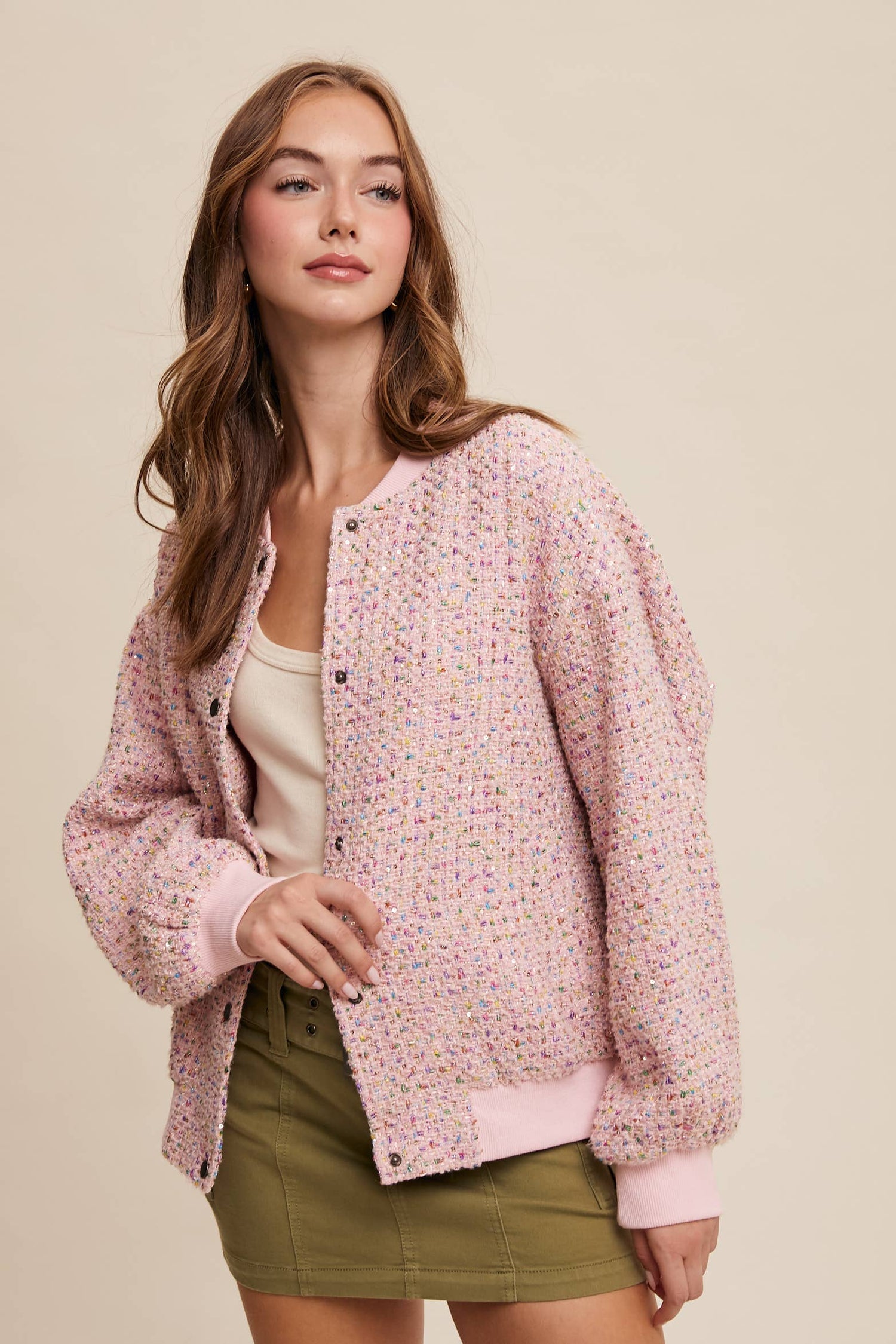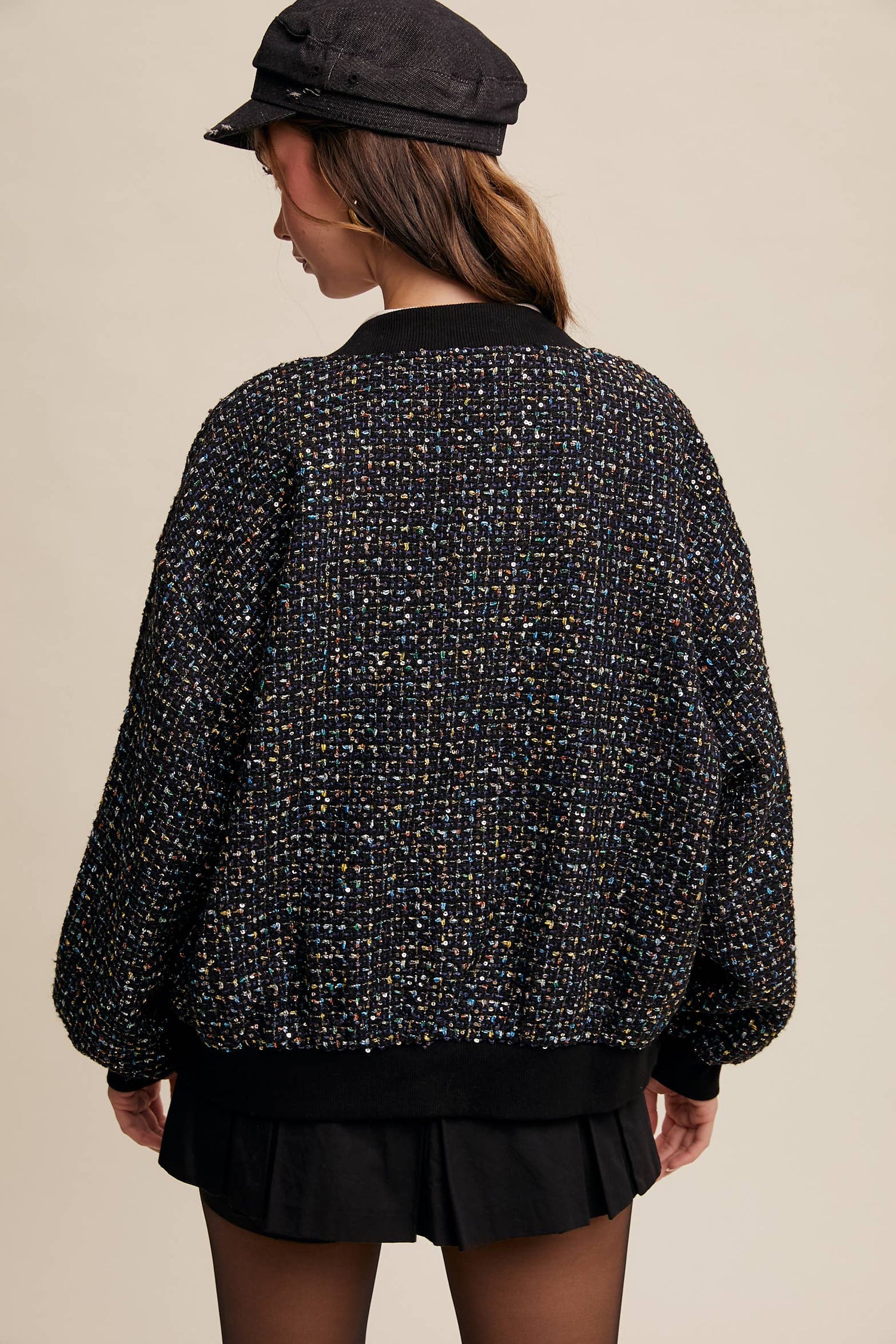 A chic twist on the classic bomber, this tweed jacket blends casual ease with elevated sparkle-perfect for layering over dresses, denim, or tailored pieces for a polished yet playful outfit.