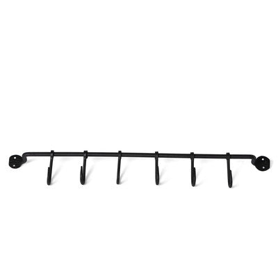 This six hook iron rack is the smaller version of of our 15 hook metal wall rod. This forged iron rack has six hooks to hang pots or kitchen accessories. This rack can also be used to display tea towels. The hooks can be moved to fit your home decor.