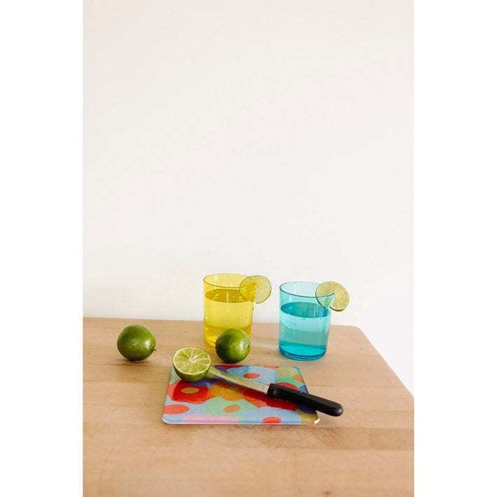 Slice and dice with style on our glass cutting board! Crafted from tempered glass, it's as durable as your love for tacos. The non-porous surface won't absorb odors or stains, making it easy to clean and upkeep. With an eye-catching floral pattern, it's the perfect addition to your kitchen decor. Plus, the non-slip silicone feet ensure you don't create a kitchen catastrophe. Made in USA. 7" x 6" tempered glass cutting board. Non-slip silicone feet. Dishwasher safe.
