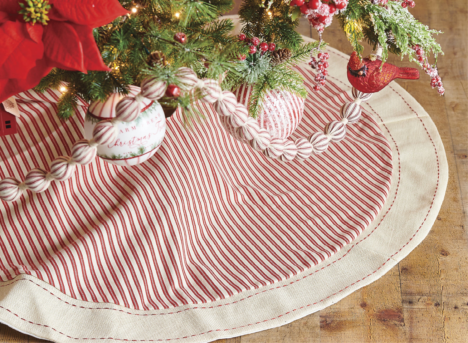 This sweet ticking stripe tree skirt looks like traditional vintage Christmas. The festive red stripes will add that simple holiday touch to your tree.