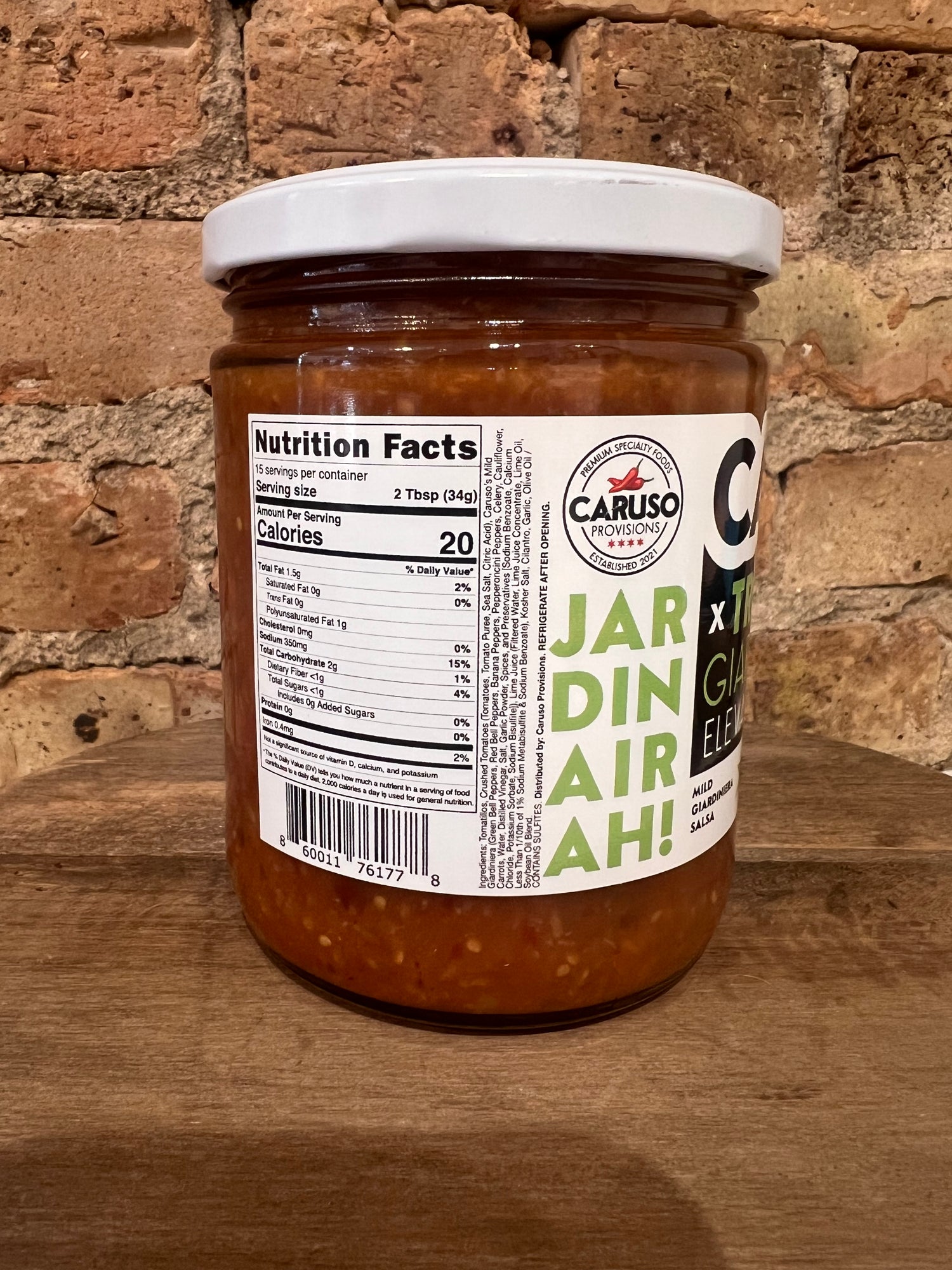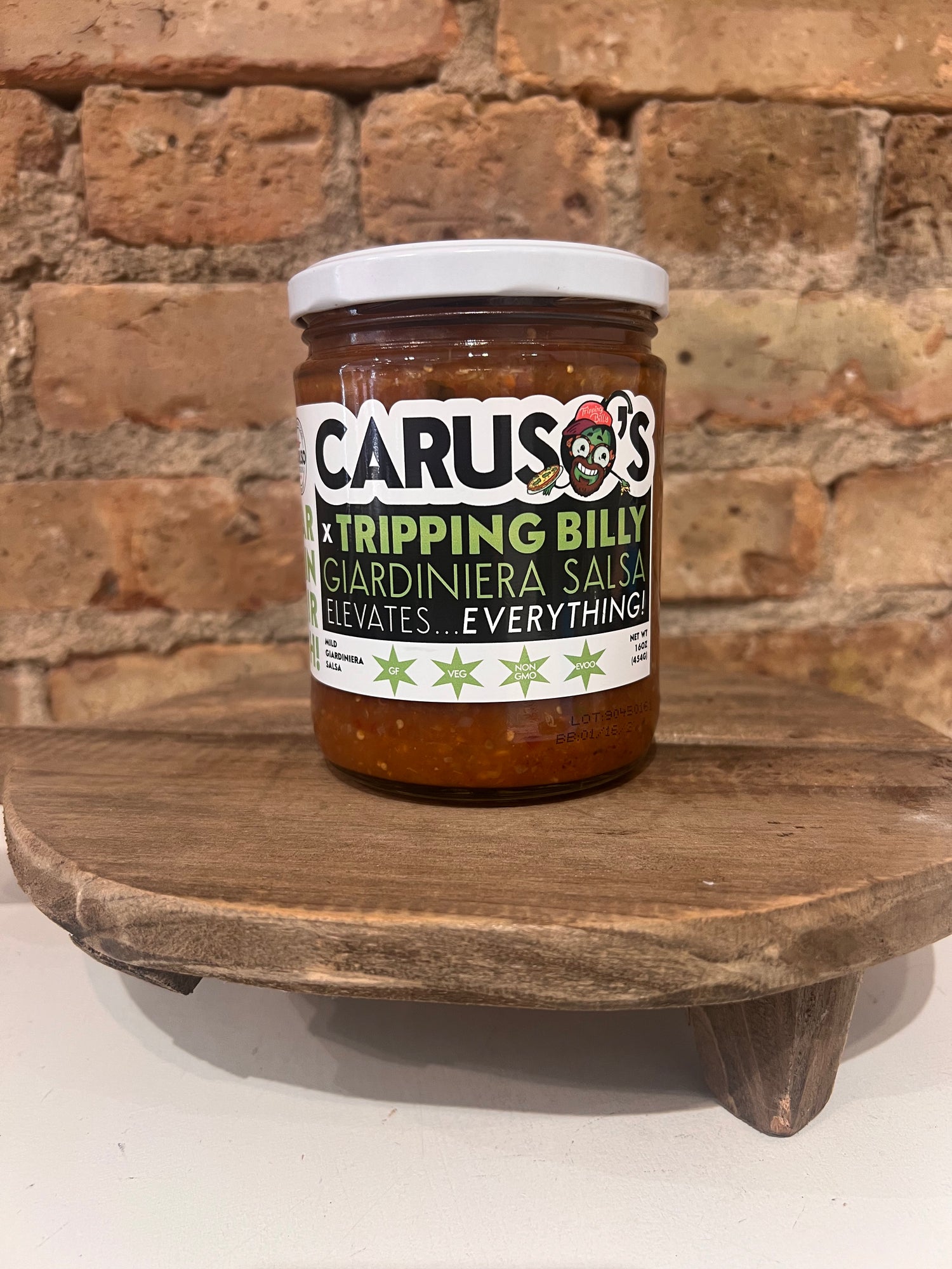 Caruso Provisions x Tripping Billy Mild Giardiniera Salsa is a collaboration with Chicago popup chef and muscular dystrophy advocate Billy "Tripping Billy" Zureikat. It is made with the finest selection of tomatoes, peppers, vegetables, and spices, blended into a smooth and flavorful salsa. It delivers the bold taste of our signature Giardiniera in a familiar, mild, approachable form that complements a wide variety of dishes.